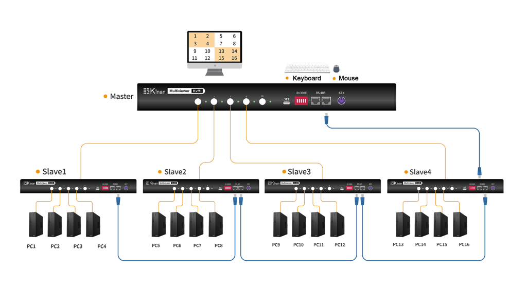 It supports cascading mode and daisy-chain mode. The users can monitor up to 16 servers via a set of keyboard and mouse connected to MH2404 and make the images displayed in up to 4 X 4 multi-view mode on the Master device. It also supports users to monitor 16 servers by using a set of keyboard and mouse via a 4 Port USB KVM Switch.