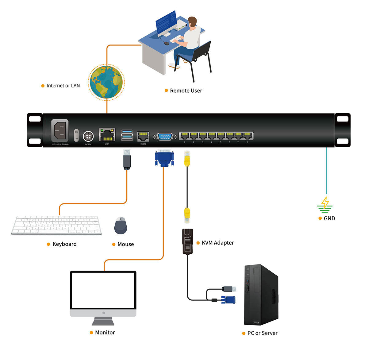 • Remote Access: 1 local user and 1 remote user can be supported, and the port share mode allows the users to gain access to a server simultaneously.