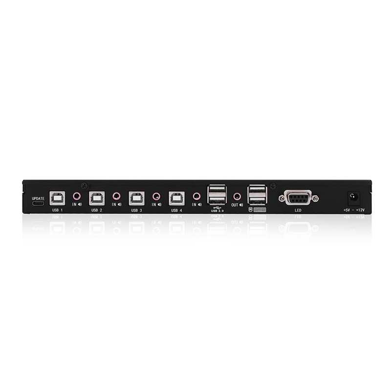 The KM0104 provides various port selection methods, users can switch between connected computers via front panel pushbuttons, keyboard hotkeys and mouse cursor.