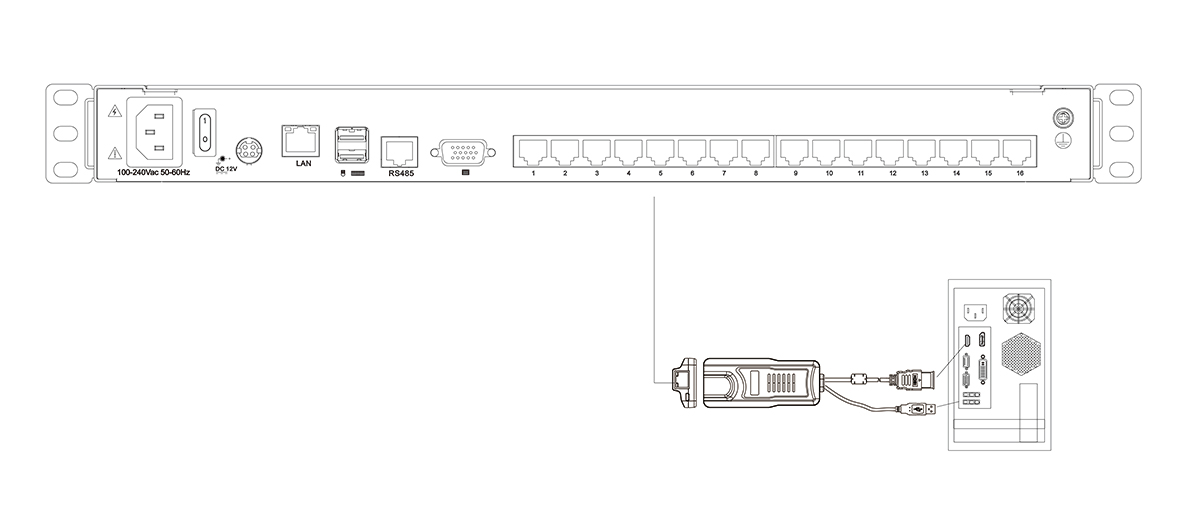 The KCM-3200H USB HDMI KVM Adapter Cable is used to connect the KVM switch to the video and USB ports of the target computer/server. The cable used to connect the dongle must be a Category 5e (shielded) CAT5/6 network cable.